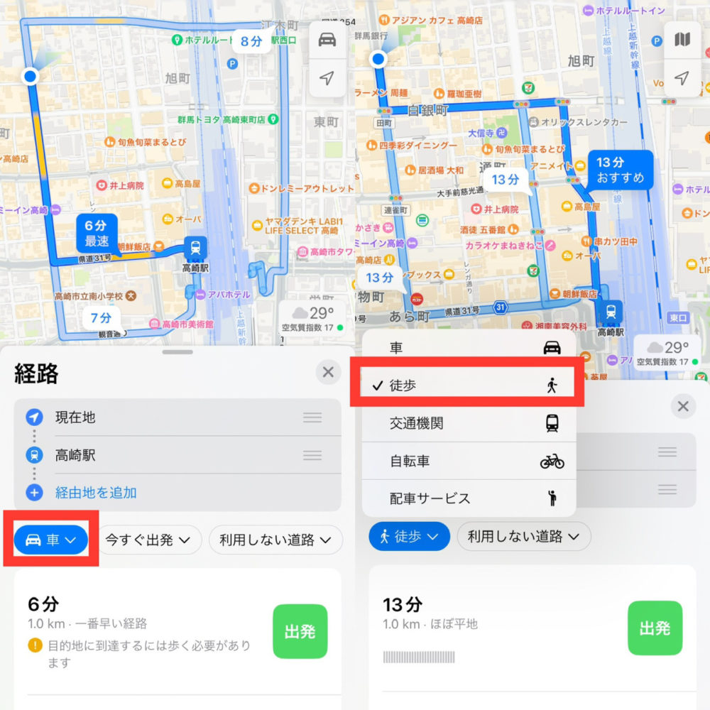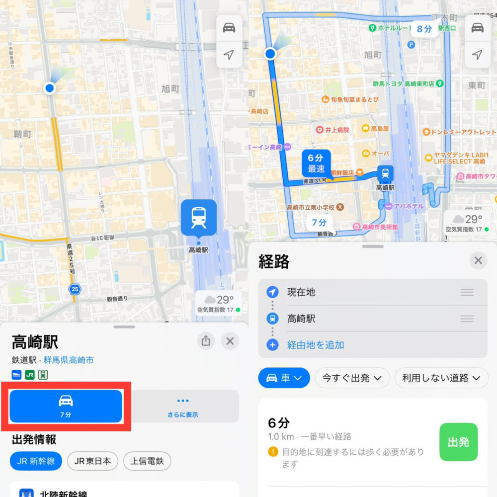 3,いくつか候補があれば、希望する経路の「出発」をタップして、経路の案内が始まります。