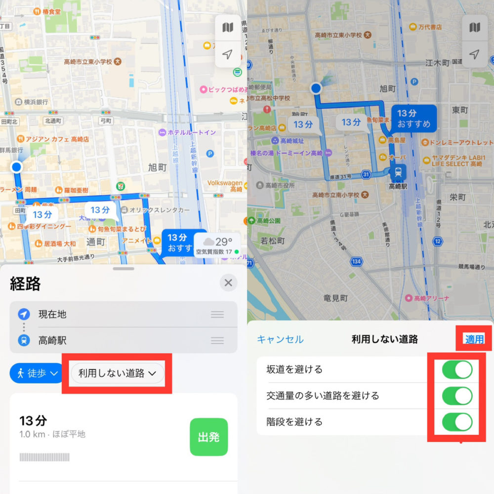 2,経路が提案されたら、以下のようなオプションを選択できます。