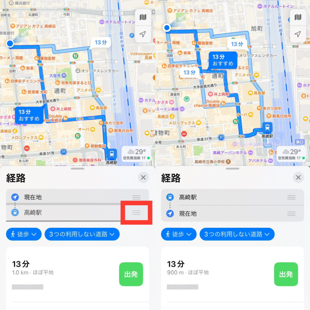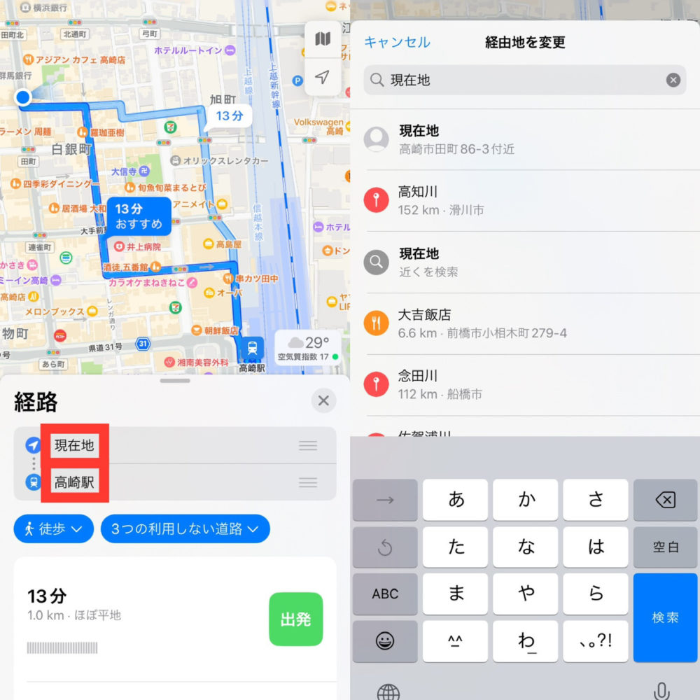 出発地もしくは目的地をタップして、場所を検索してその場所に変更します。
