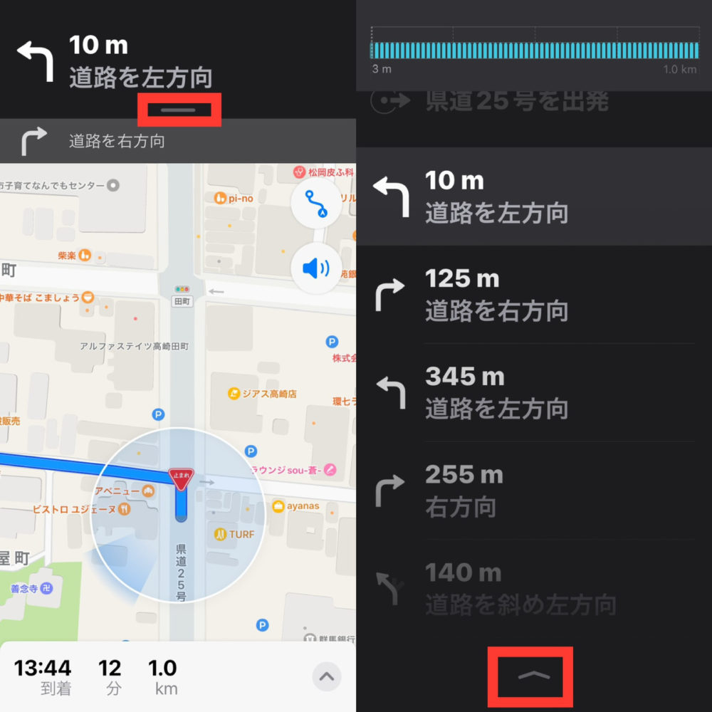 曲がり角リストを確認したい場合は、画面の上部にあるバナーをタップします。下にスクロールするとさらに経路を表示します。確認したら、「マップボタン^」をタップします。